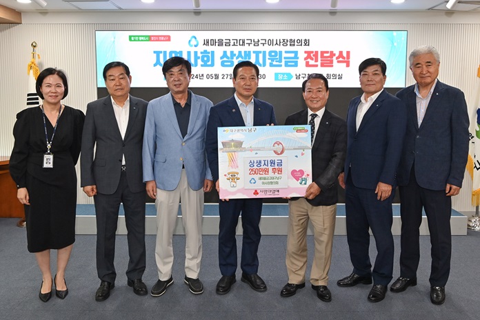 새마을금고 대구남구이사장협의회(회장 박판년)는 25일 새마을금고 창립기념일인 동시에 ‘MG새마을금고 지역상생의 날’을 기념해 새마을금고중앙회(회장 김인)의 상생지원금 250만원을 대구 남구에 전달했다.