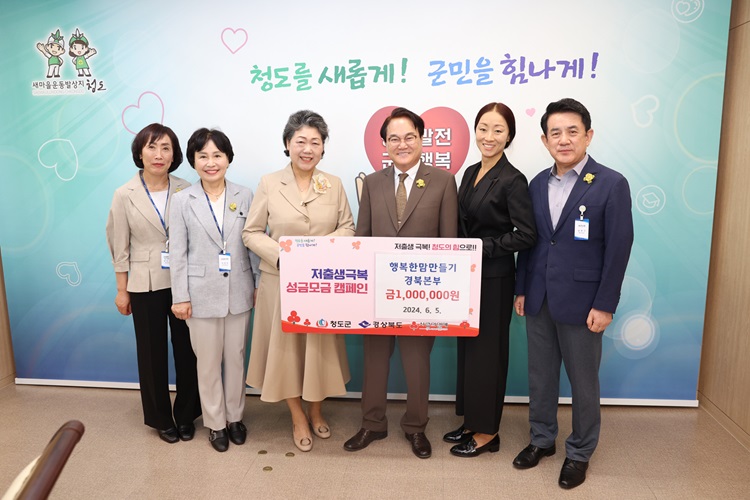 청도군은 지난 5일 (사)행복한맘 만들기 경북본부(본부장 구정숙)에서 국가적 과제인 저출생 극복에 기여하고자 저출생 극복을 위한 성금 100만원을 기탁했다고 밝혔다.